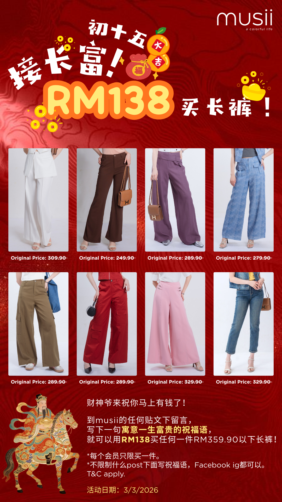 到musii的任意贴文下方留言,写下寓意一生富贵的祝福语,就可以用RM138买任何一件RM359.90以下长裤!